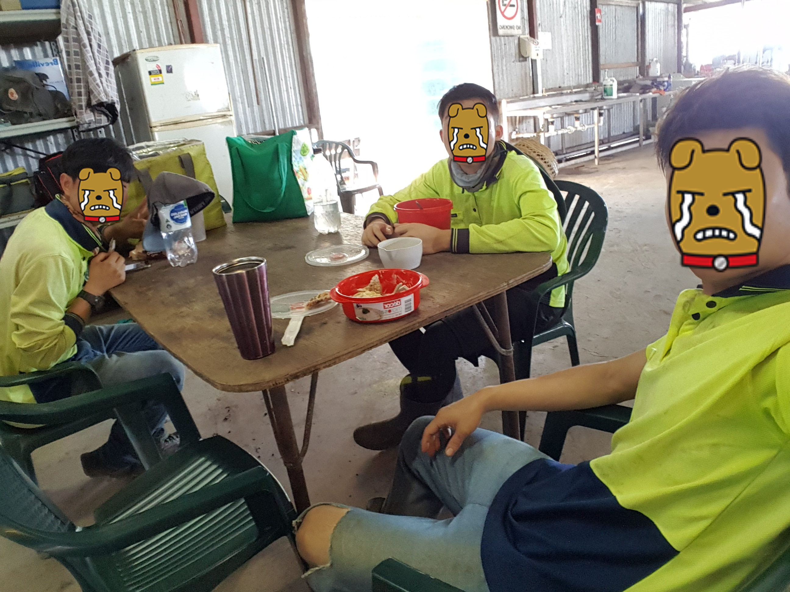 점심시간, 쉐드안에서 먹는다. 먹는 곳이 두 군데가 있는데 한 군데는 패킹하는 여자애들이 많은 곳이다.