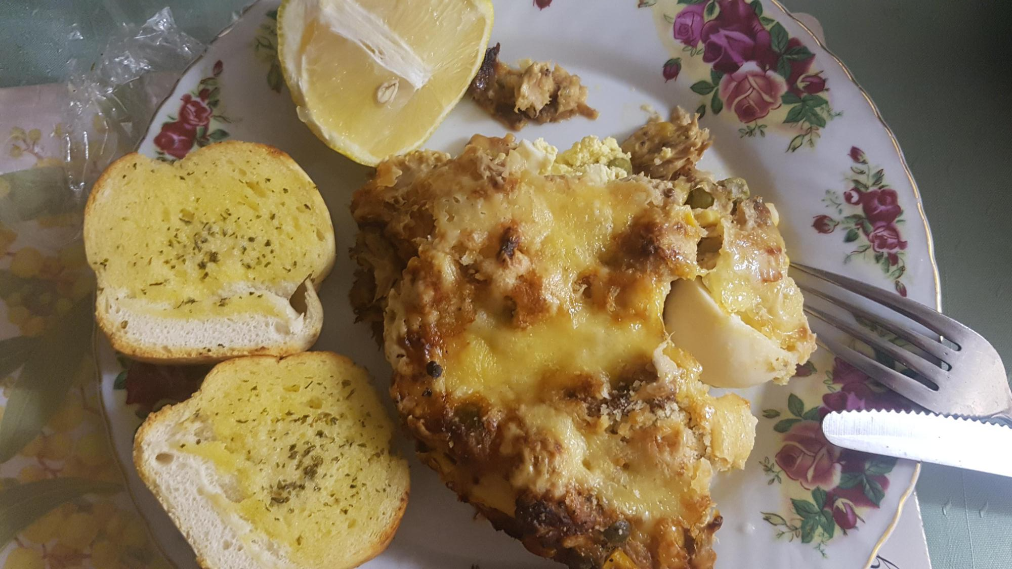 생선까스 with 삶은 야채, 레몬 한조각 할아버지는 한 마리의 고양이, 한마리의 리트리버, 다섯 마리의 새끼 강아지들과