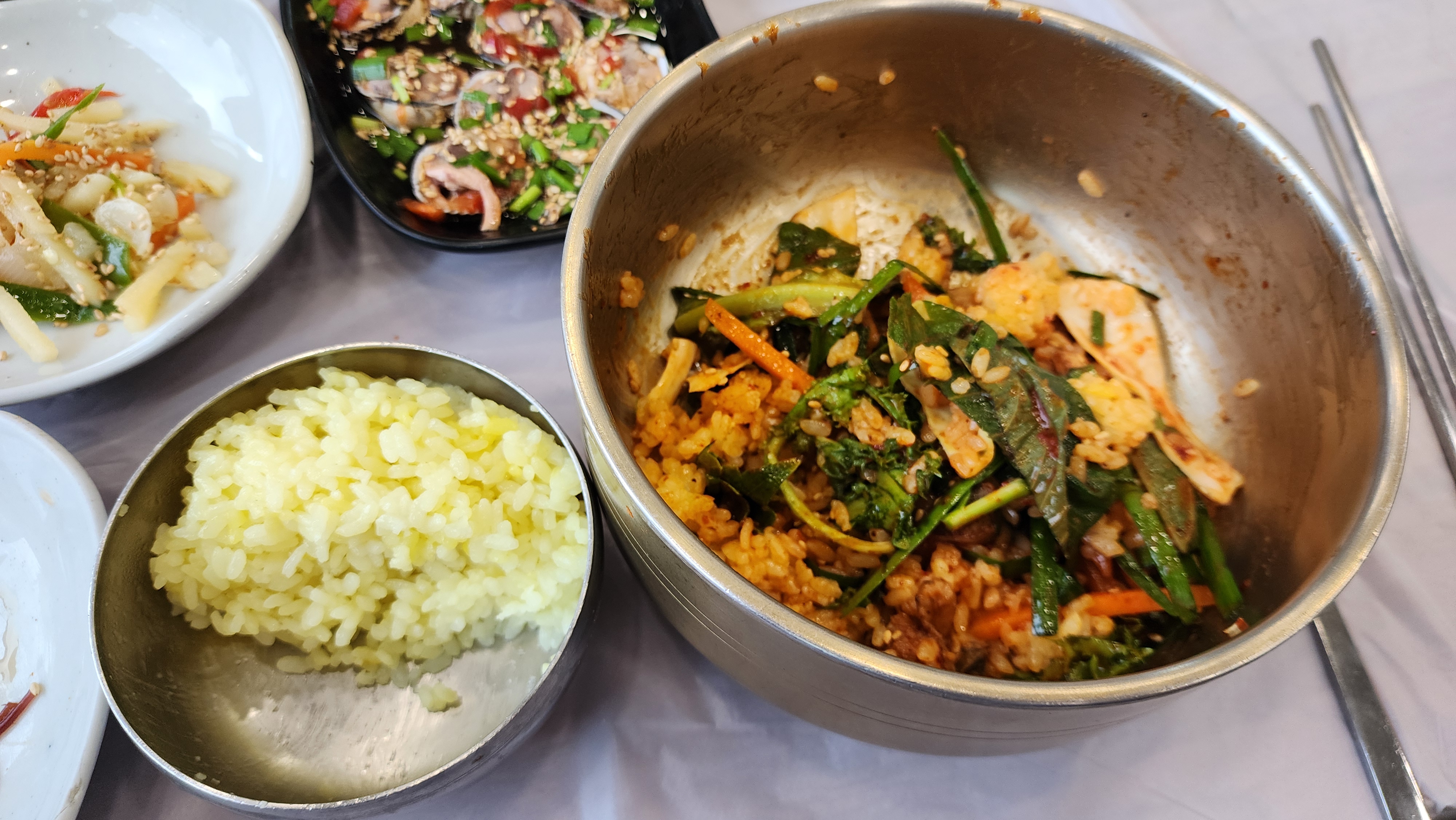 밥은 강황이 들어갔는지 약간 노랗습니다. 밥 하나도 정성이 느껴졌어요. 사장님 추천으로 반은 꼬막무침에 비벼먹고 반은 반찬들과 같이 먹었어요